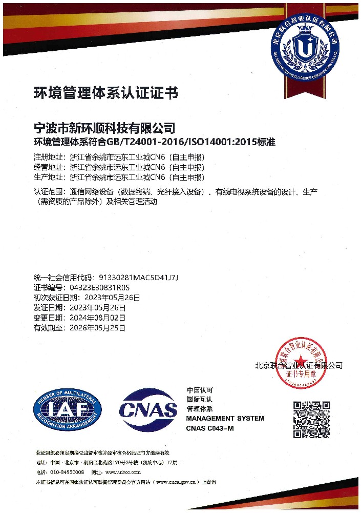 ISO14001 環(huán)境管理體系證書